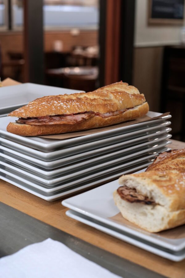 Pan recién horneado, bocadillo del día con bebida y opciones de cuchillo y tenedor.